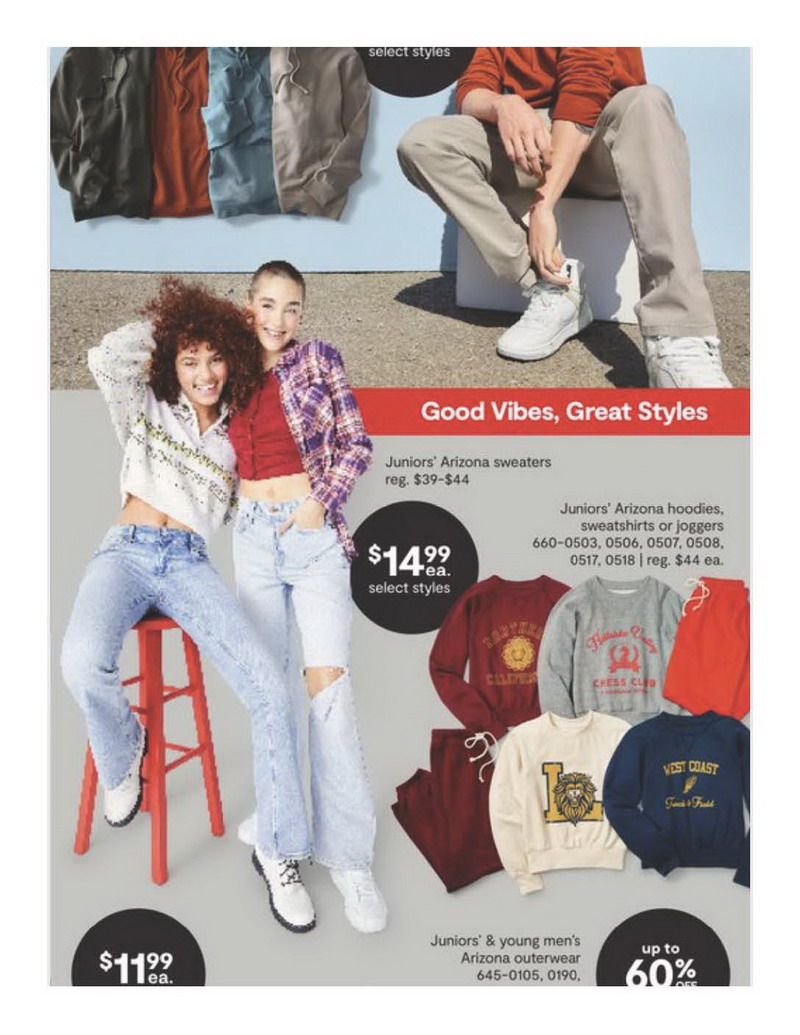 | JCPenney | Apparel Shoes | Juniors' Arizona sweaters | 14.99 |