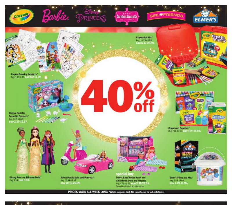 | Meijer | Toys | 40% off Crayola Scribble Scrubbie Products | 2.39-16.97 |