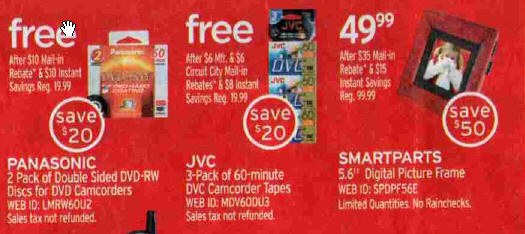 Circuit City has the Panasonic 2-pack double sided DVD-RW discs for DVD Camcoders for FREE after rebate on black friday. Regular price $19.99