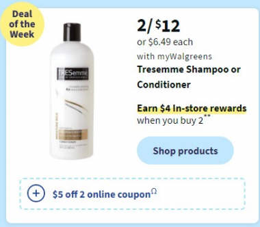 2/ $12 or $6.49 each with myWalgreens Tresemme Shampoo or Conditioner Earn $4 In-store rewards when you buy