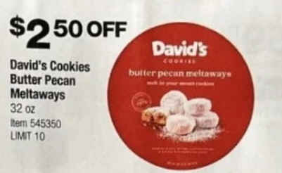 $2.50 off David's Cookies Butter Pecan Meltaways 32 oz, 2-pack