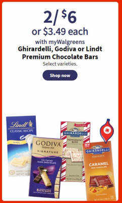 2/ $6 or $3.49 each with myWalgreens Ghirardelli, Godiva or Lindt Premium Chocolate Bars