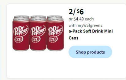 2/ $6 or $4.49 each with myWalgreens 6-Pack Soft Drink Mini Cans