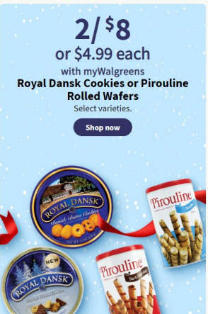 2/ $8 or $4.99 each with myWalgreens Royal Dansk Cookies or Pirouline Rolled Wafers