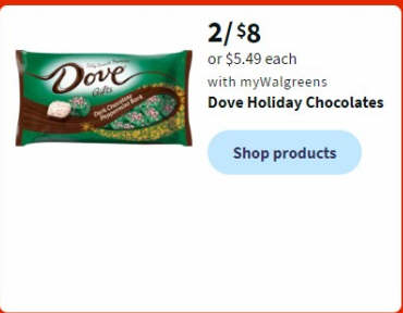 2/ $8 or $5.49 each with myWalgreens Dove Holiday Chocolates