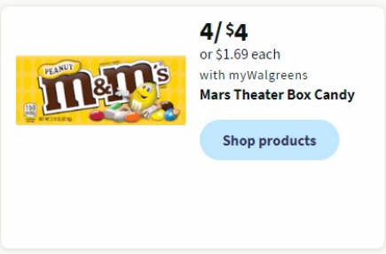4/ $4 or $1.69 each with myWalgreens Mars Theater Box Candy
