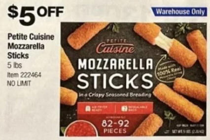 $5 off Petite Cuisine Mozzarella Sticks 5 lbs