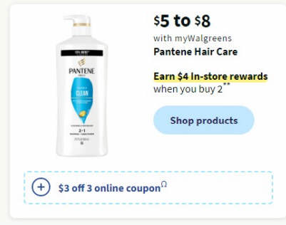 $5 to $8 with myWalgreens Pantene Hair Care Earn $4 In-store rewards when you buy 2