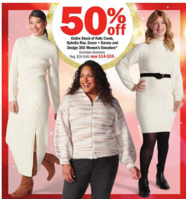 50% off Entire Stock of Falls Creek, Ophelia Roe, Grace + Karma and Design 365 Women's Sweaters