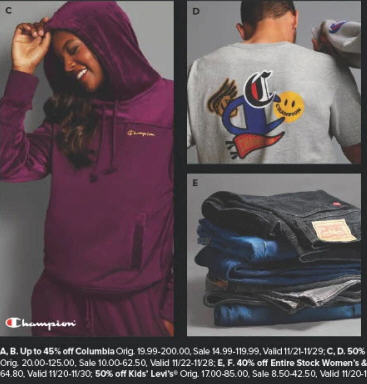 50% off Entire Stock Womens & Mens Champion. Valid 11/22-11/28