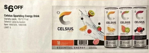 $6 off Celsius Sparkling Energy Drink Variety pack, 18/12 fl oz Selection vanes by location