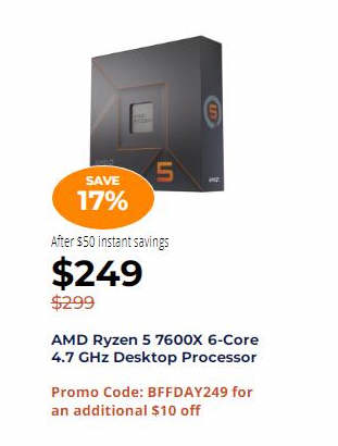 AMD Ryzen 5 7600X 6-Core 4.7 GHz Desktop Processor $249 via Promo Code: BFFDAY249