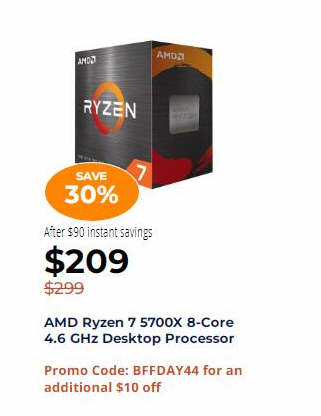 AMD Ryzen 7 5700X 8-Core 4.6 GHz Desktop Processor $209 via Promo Code: BFFDAY44