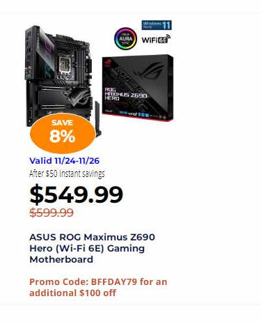 ASUS ROG Maximus Z690 Hero (Wi-Fi 6E) Gaming Motherboard $549 via Promo Code: BFFDAY79