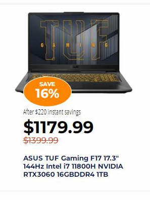 ASUS TUF Gaming F17 17.3" 144Hz Intel i7 11800H NVIDIA RTX3060 16GBDDR4 1TB