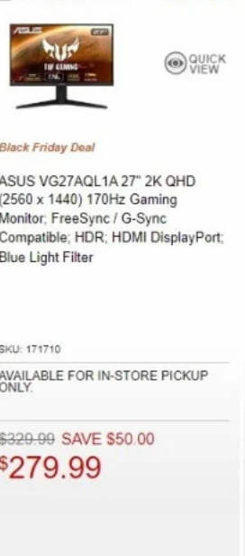 ASUS VG27AQL1A 27" 2K QHD (2560 x 1440) 170Hz Gaming Monitor FreeSync / G-Sync Compatible; HDR; HDMI DisplayPort; Blue Light Filter