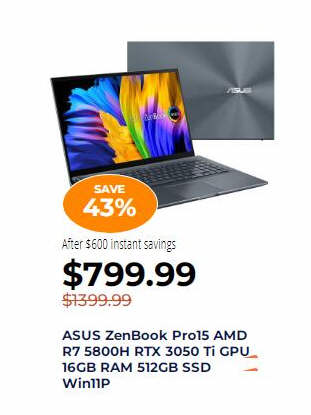 ASUS ZenBook Pro15 AMD R7 5800H RTX 3050 Ti GPU 16GB RAM 512GB SSD Win11P
