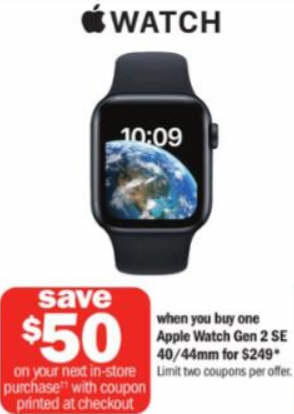 Apple Watch Gen 2 SE 40/44mm + $50 off your next in-store purchase with coupon printed at checkout