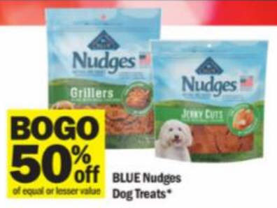 BOGO of equal or lesser value 50% off BLUE Nudges Dog Treats