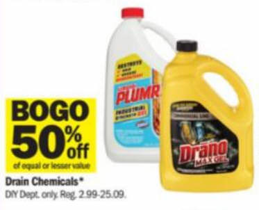 BOGO of equal or lesser value 50% off Drain Chemicals