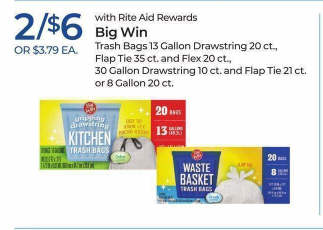 Big Win Trash Bags 13 Gallon Drawstring 20 ct., Flap Tie 35 ct. and Flex 20 ct., 30 Gallon Drawstring 10 ct. and Flap Tie 21 ct. or 8 Gallon 20 ct. 2 for $6