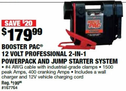 Booster PAC Industrial-Grade 12 Volt Jumpstarter and Power Source 1500 Peak Amps, Model# ES5000