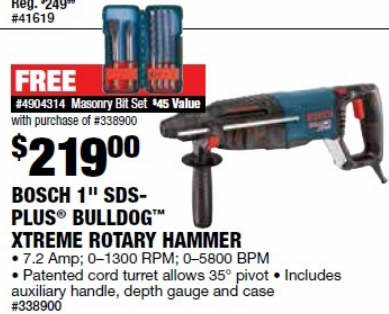 Bosch SDS+ BULLDOG Xtreme Corded Rotary Hammer 1in. Chuck, 5800 BPM, 7.5 Amp, 2.2 Ft./Lbs., Model# 11255VSR