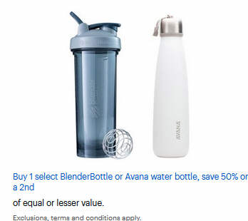 Buy 1 select BlenderBottle or Avana water bottle, save 50% on a 2nd