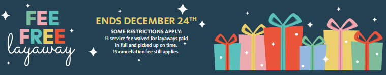 ENDS DECEMBER 24 SOME RESTRICTIONS APPLY: $3 service fee waived for layaways paid in full and picked up on time. $5 cancellation fee still applies.