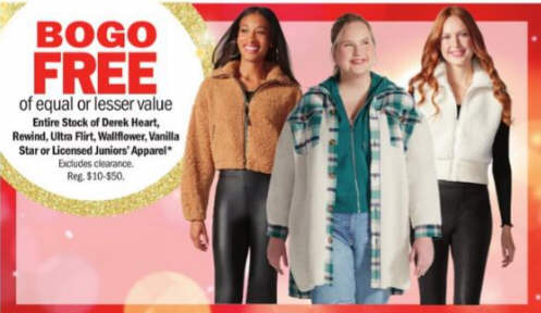 Entire Stock of Derek Heart, Rewind, Ultra Flirt, Wallflower, Vanilla Star or Licensed Juniors' Apparel: BOGO of equal or lesser value FREE