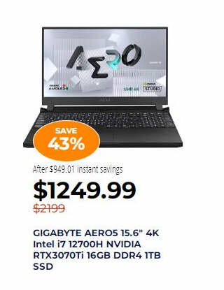 GIGABYTE AERO5 15.6" 4K Intel i7 12700H NVIDIA RTX3070Ti 16GB DDR4 1TB SSD