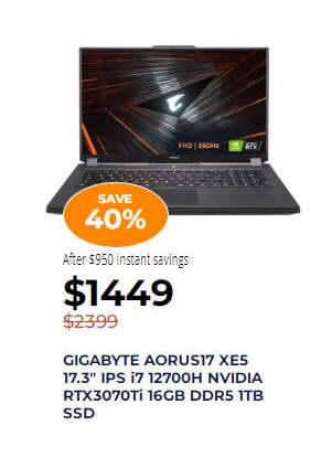 GIGABYTE AORUS17 XE5 17.3" IPS i7 12700H NVIDIA RTX3070Ti 16GB DDR5 1TB SSD