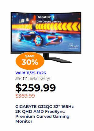 GIGABYTE G32QC 32" 165Hz 2K QHD AMD FreeSync Premium Curved Gaming Monitor