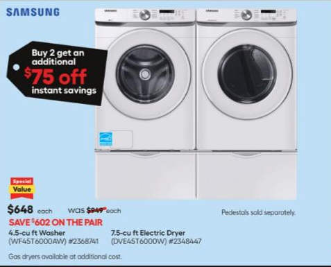 Get Extra $75 off Samsung 4.5-cu ft High Efficiency Stackable Front-Load Washer (White) ENERGY STAR + 7.5-cu ft Stackable Electric Dryer (White)