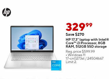 HP 17.3" laptop with Intel Core i3 Processor, 8GB RAM, 512GB SSD storage