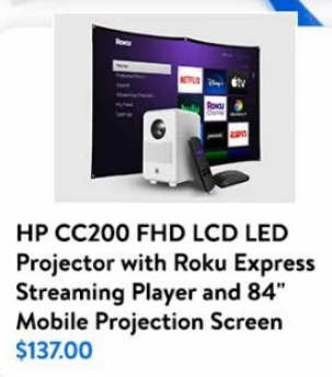 HP CC200 FHD LCD LED Projector with Roku Express Streaming Player and 84" Mobile Projection Screen