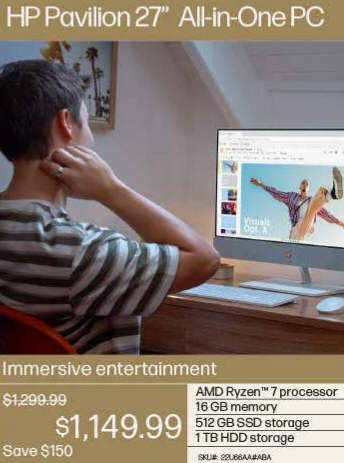 HP Pavilion 27-ca1075z All-in-One PC: AMD Ryzen 7 processor, 16 GB memory; 1 TB HDD storage; 512 GB SSD storage