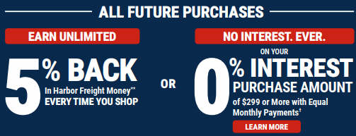 Harbor Freight Credit Card: Combine Your Discounts Get an Extra 10% off Black Friday Sale the Main Event on Your First Purchase When you Open an account + All Future Purchases 5% Back or 0% Interest Purchase of $299 or More