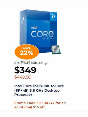 Intel Core i7-12700K 12-Core (8P+4E) 3.6 GHz Desktop Processor $349 via Code BFFDAY47