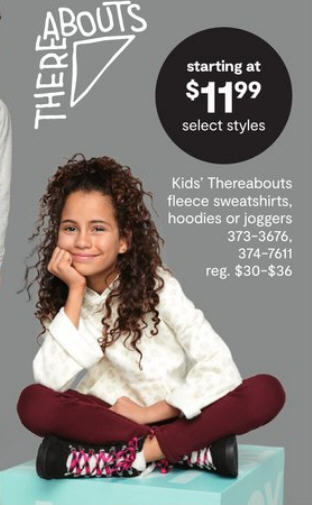 Kids' Thereabouts fleece sweatshirts, hoodies or joggers from $11.99