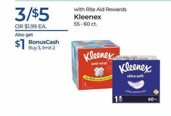 Kleenex 55 - 60 ct. 3 for $5 Also get $1 BonusCash