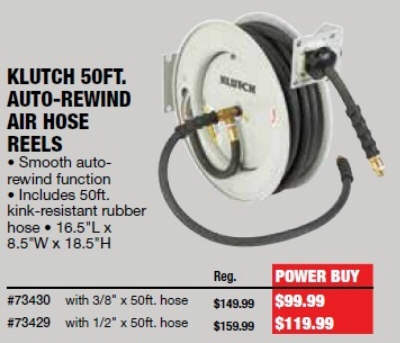 Klutch Auto-Rewind Air Hose Reel - with 3/8in. x 50ft. Rubber Hose, 300 PSI