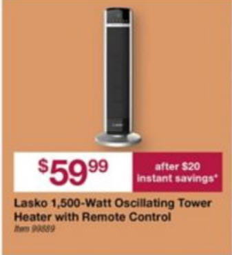 Lasko 1,500W Oscillating Tower Heater with Remote Control