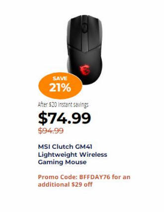 MSI Clutch GM41 Lightweight Wireless Gaming Mouse $74.99 via coupon BFFDAY76