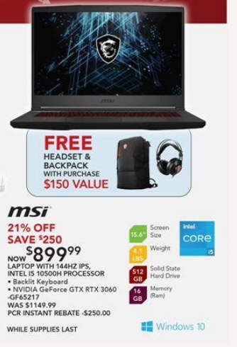 MSI GF Series 15.6" Laptop with 144Hz IPS, Intel i5 10500H Processor, NVIDIA GeForce RTX 3060, 16GB RAM, 512GB SSD, Windows 10 Home and FREE MSI Headset/Backpack Bundle ($150 Value)