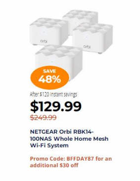 NETGEAR Orbi RBK14-100NAS Whole Home Mesh Wi-Fi System $129.99 via coupon BFFDAY87