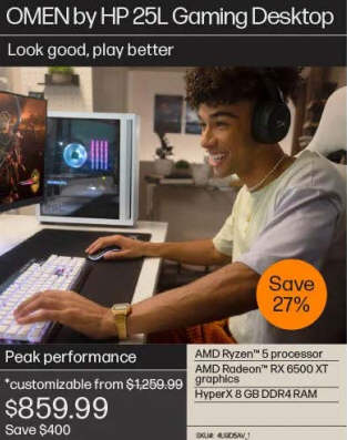 OMEN 25L Gaming Desktop AMD Ryzen 5 processor AMD Radeon RX 6500 XT graphics HyperX 8 GB DDR4 RAM