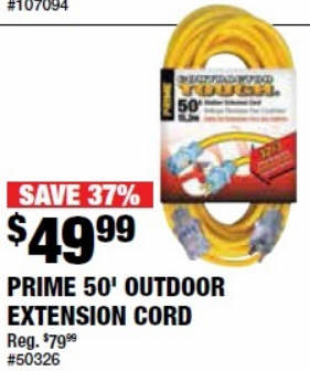 Prime Wire & Cable Contractor Tough Outdoor Extension Cord 50ft., 12/3 Gauge, 15 Amps, Yellow, Model# EC511830