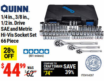 QUINN 1/4 in., 3/8 in., 1/2 in. Drive SAE & Metric Hi-Vis Socket Set, 66 Piece