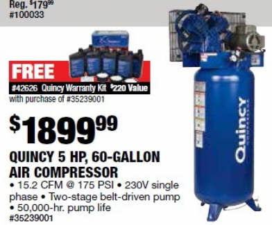 Quincy QT-54 Splash Lubricated Reciprocating Air Compressor 5 HP, 230 Volt, 1 Phase, 60-Gallon Vertical, Model# 2V41C60VC